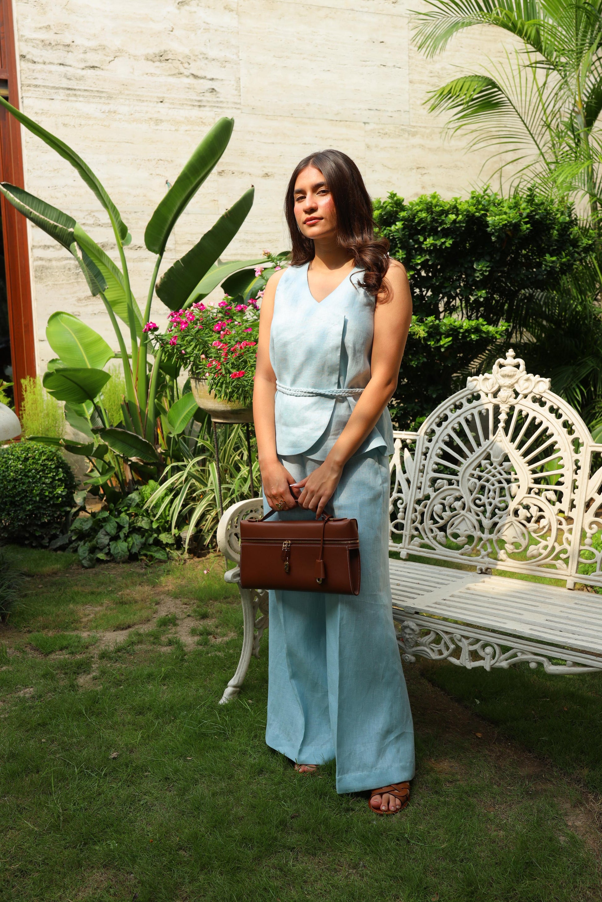 Our linen co-ord set is designed for effortless summer elegance. The sleeveless top features layered tailoring and comes with a braided rope belt finished with pearls, adding a touch of sophistication. Paired with matching linen trousers, this set offers breathable comfort and versatile style.