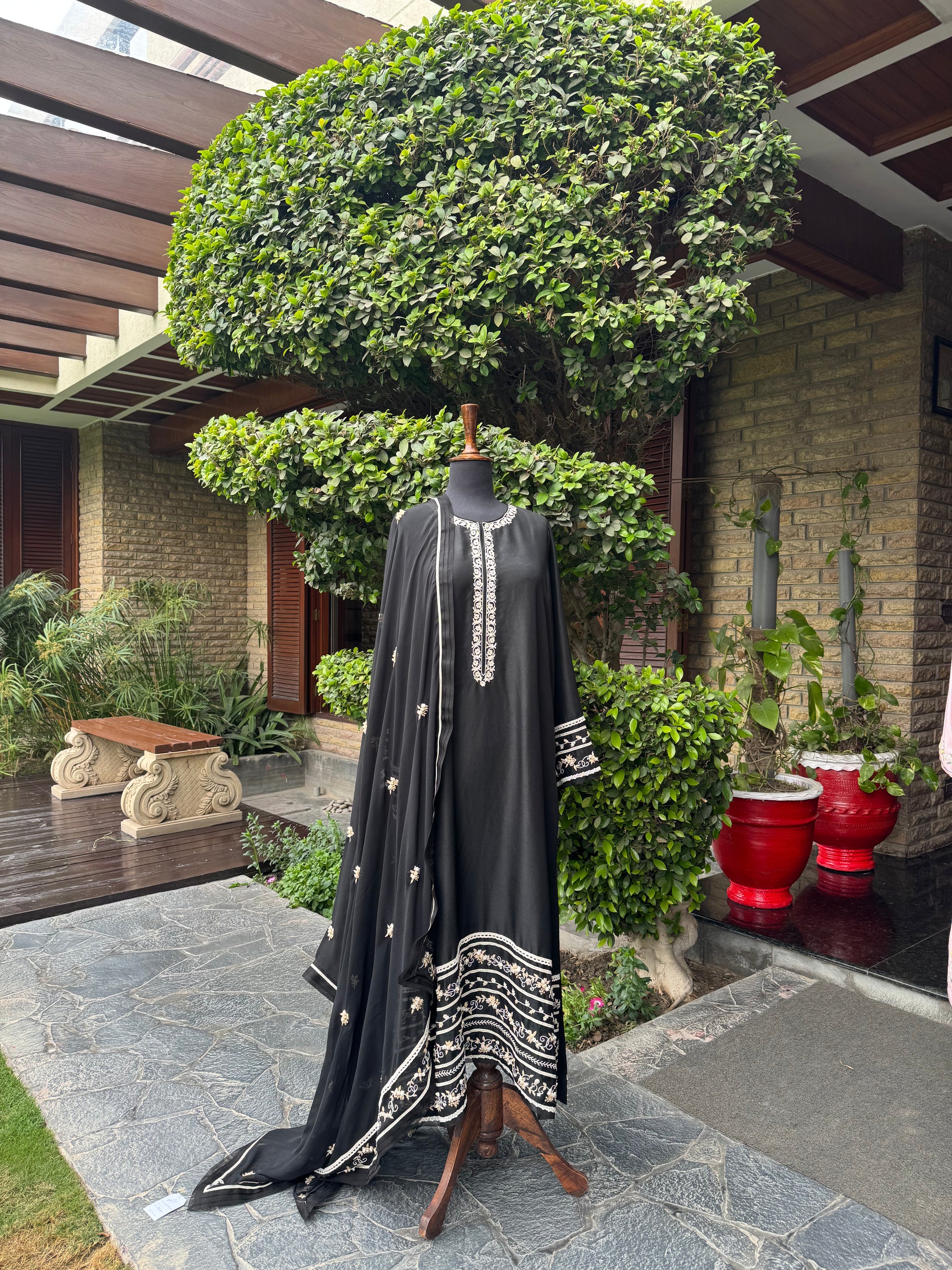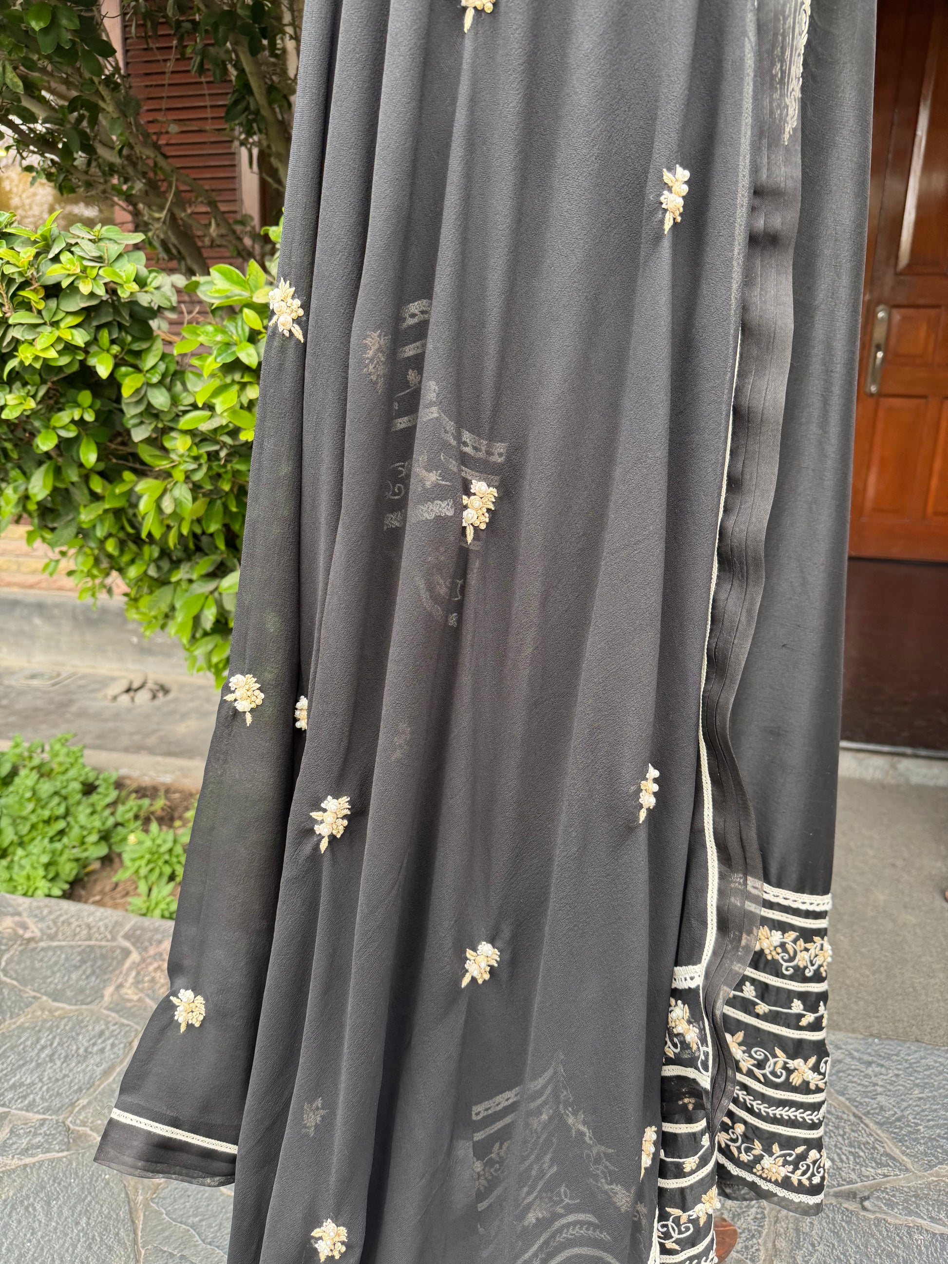 Timeless. Elegant. Effortlessly versatile. This black hand-embroidered dupatta is available to order in your choice of pure organza or pure georgette — each fabric lending its own graceful drape and texture. Thoughtfully finished with pleated organza edging and delicate lace details, this piece is designed to transcend trends and live in your wardrobe for years to come.