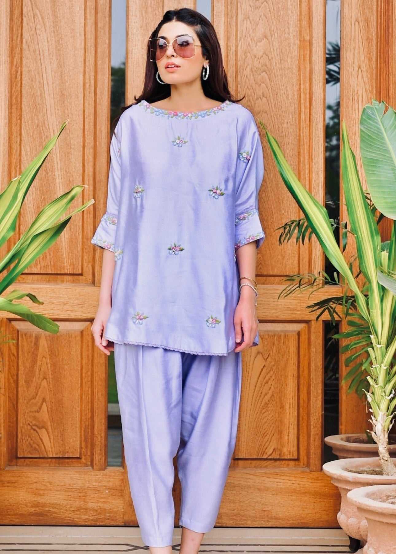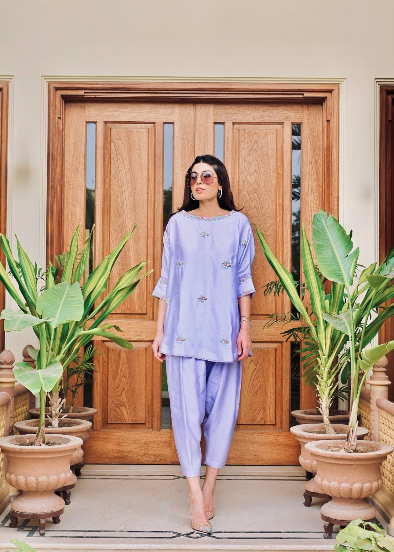 Soft, serene, and effortlessly graceful — this powder blue kurta and shalwar set is crafted in pure cotton net, featuring delicate hand embroidery and a charming floral design. Paired with a tailored pure cotton-silk shalwar, this outfit offers breathable comfort and refined elegance in one versatile silhouette.