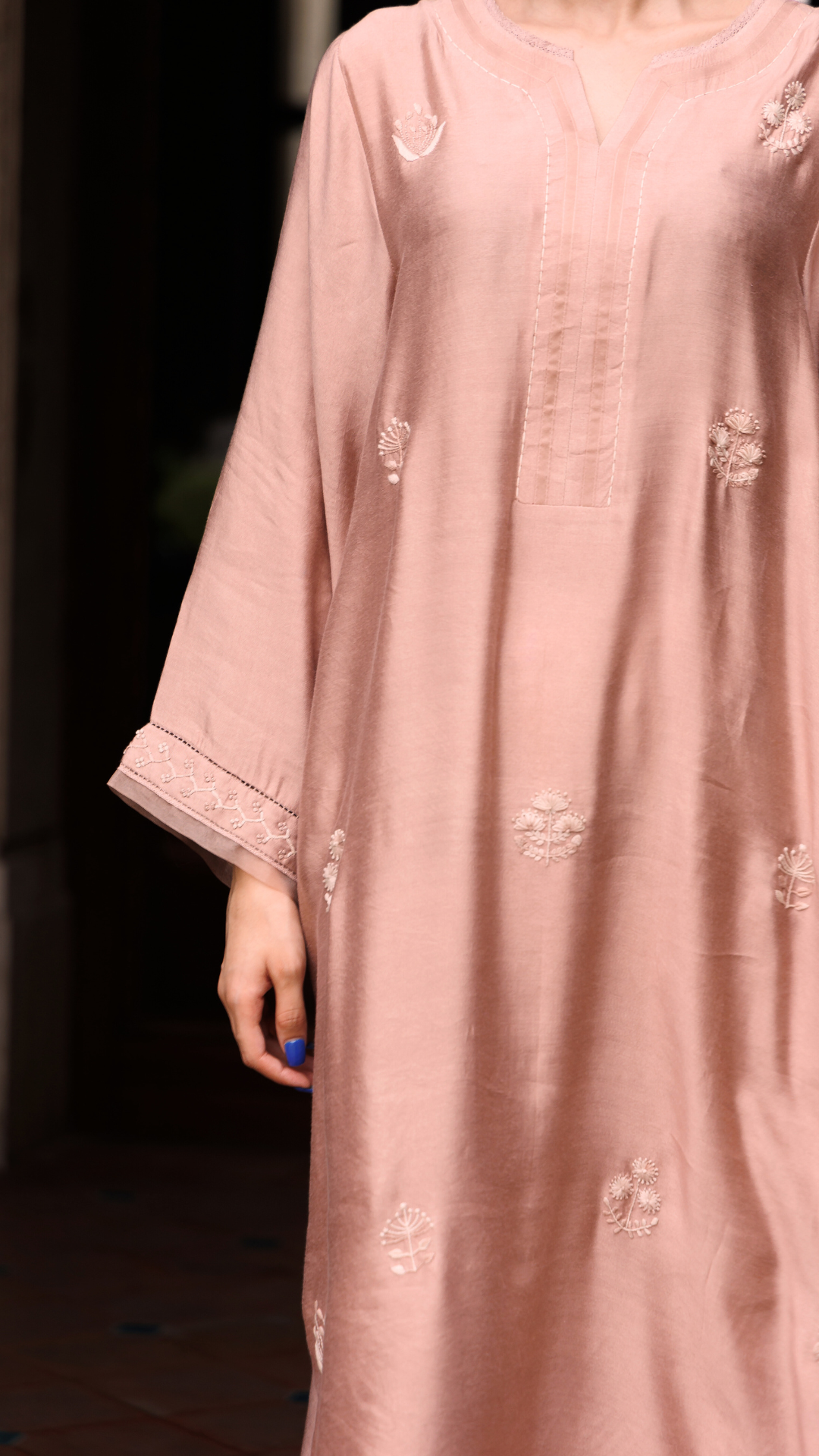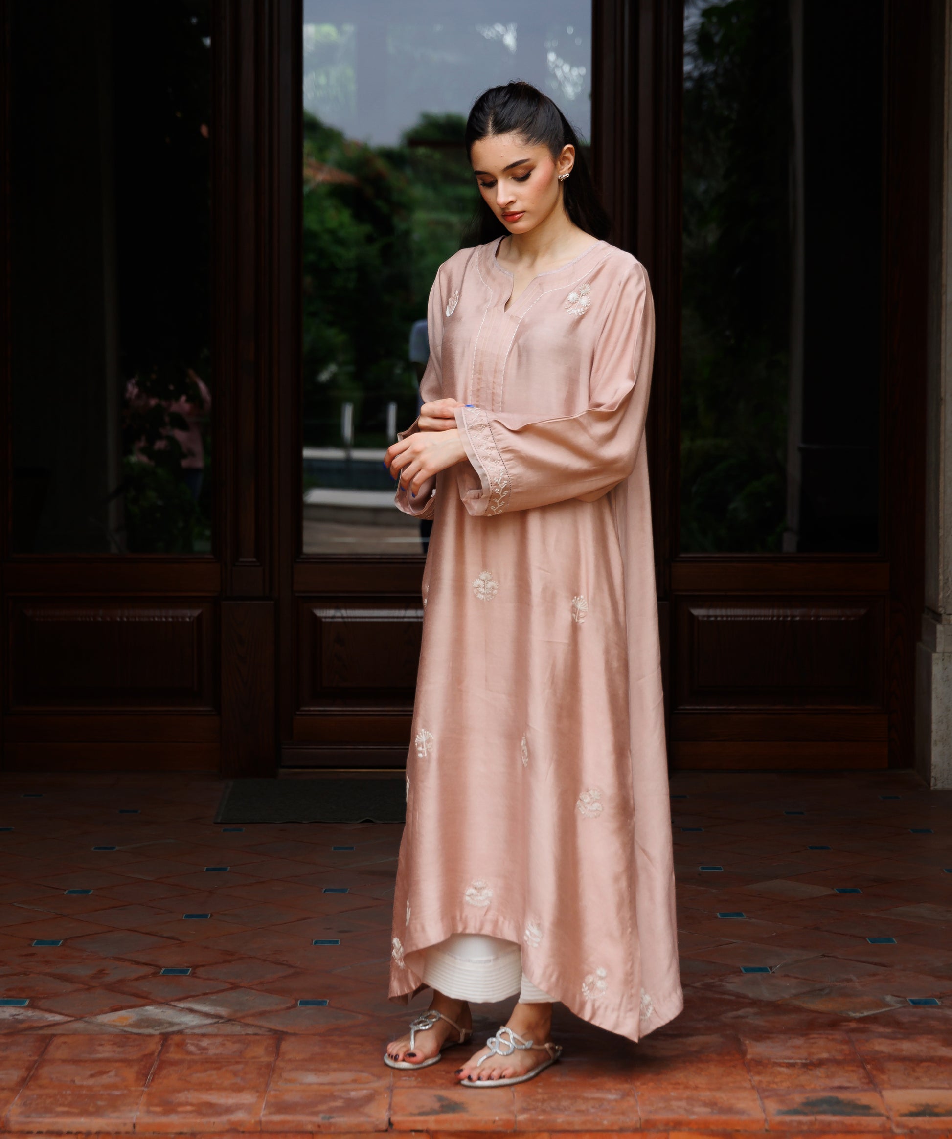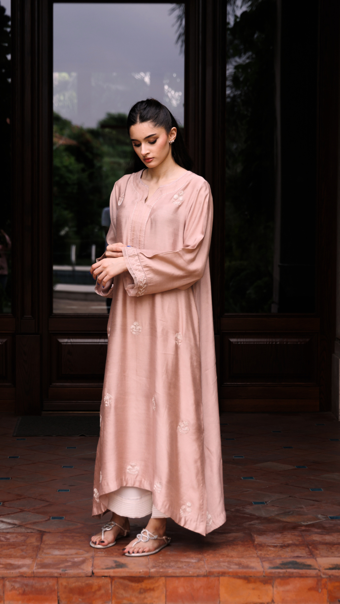 Blush Mirage is a refined kurta crafted on pure cotton silk, featuring delicate hand embroidery accentuated with graceful organza lace details. Rendered in an elegant taupe shade, this piece blends sophistication with subtle charm. The long kurta cut offers a flattering silhouette, while customization is available for a tailored fit.
