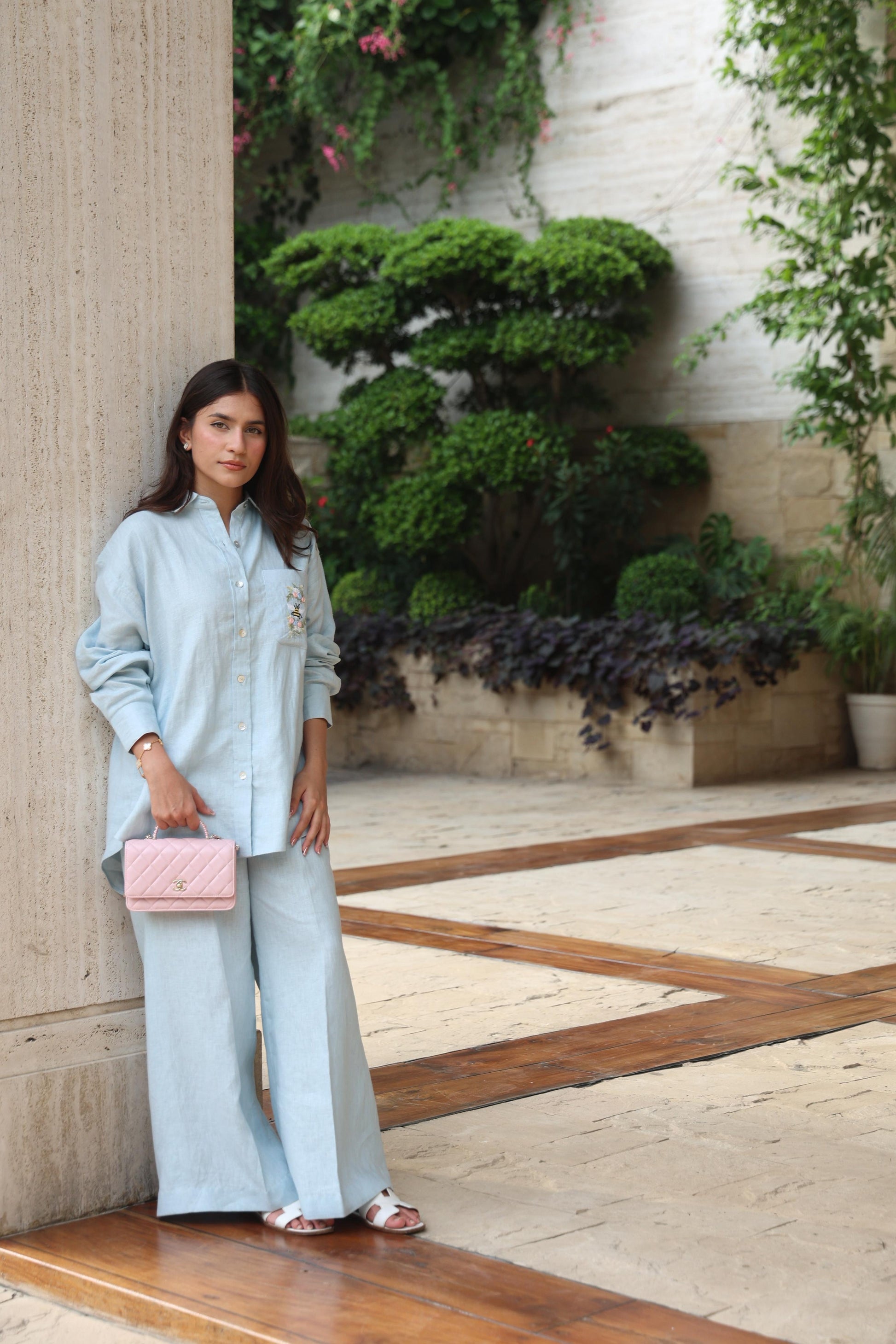 A timeless linen shirt elevated with hand embroidery. Featuring a delicate floral motif and a charming bee detail on the front pocket, this piece blends everyday comfort with artisanal charm.