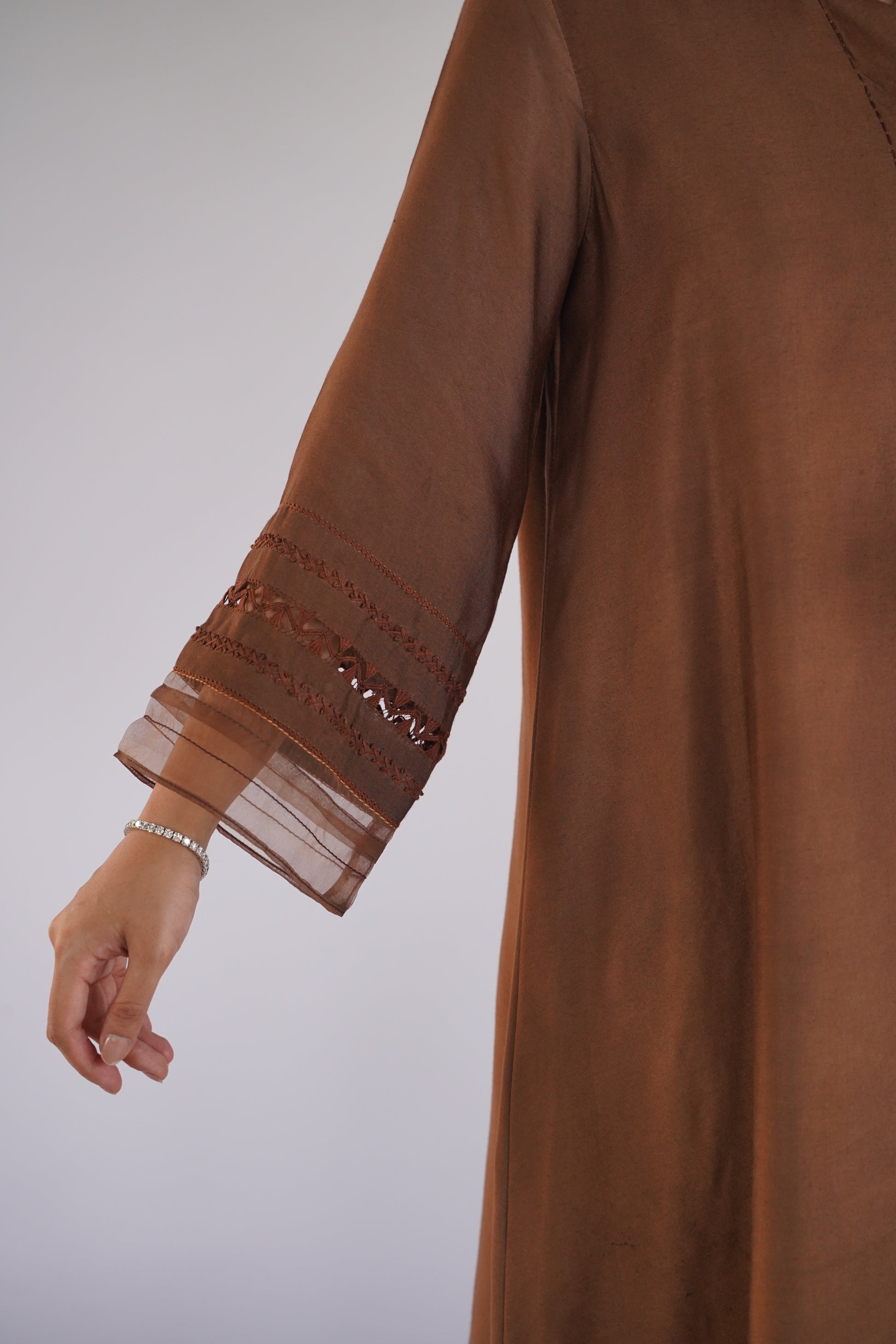 Abstract hand embroider patterns and Tarkashi on the sleeves finished with organza and lace details on the sleeves and hem of the shirt.