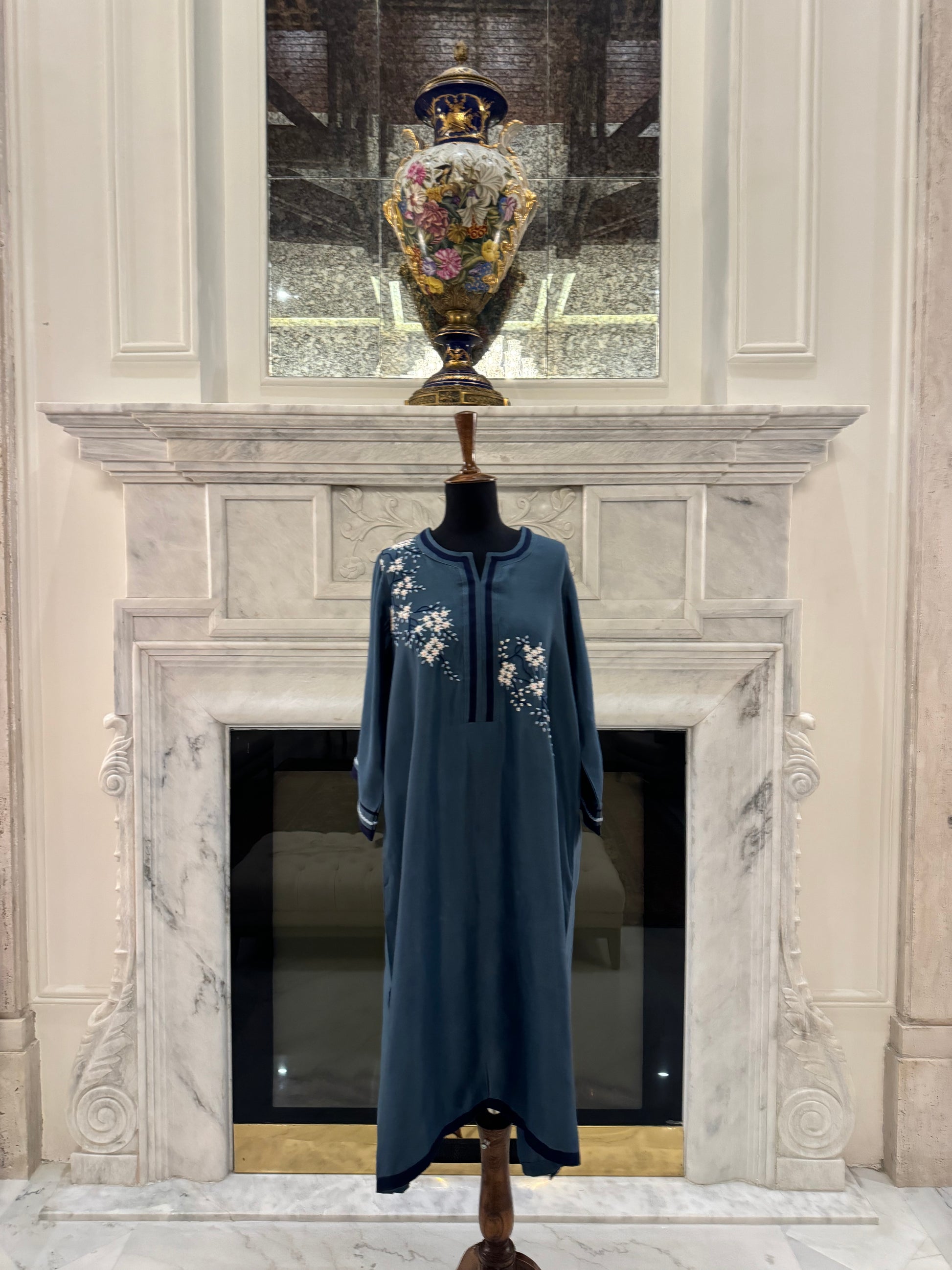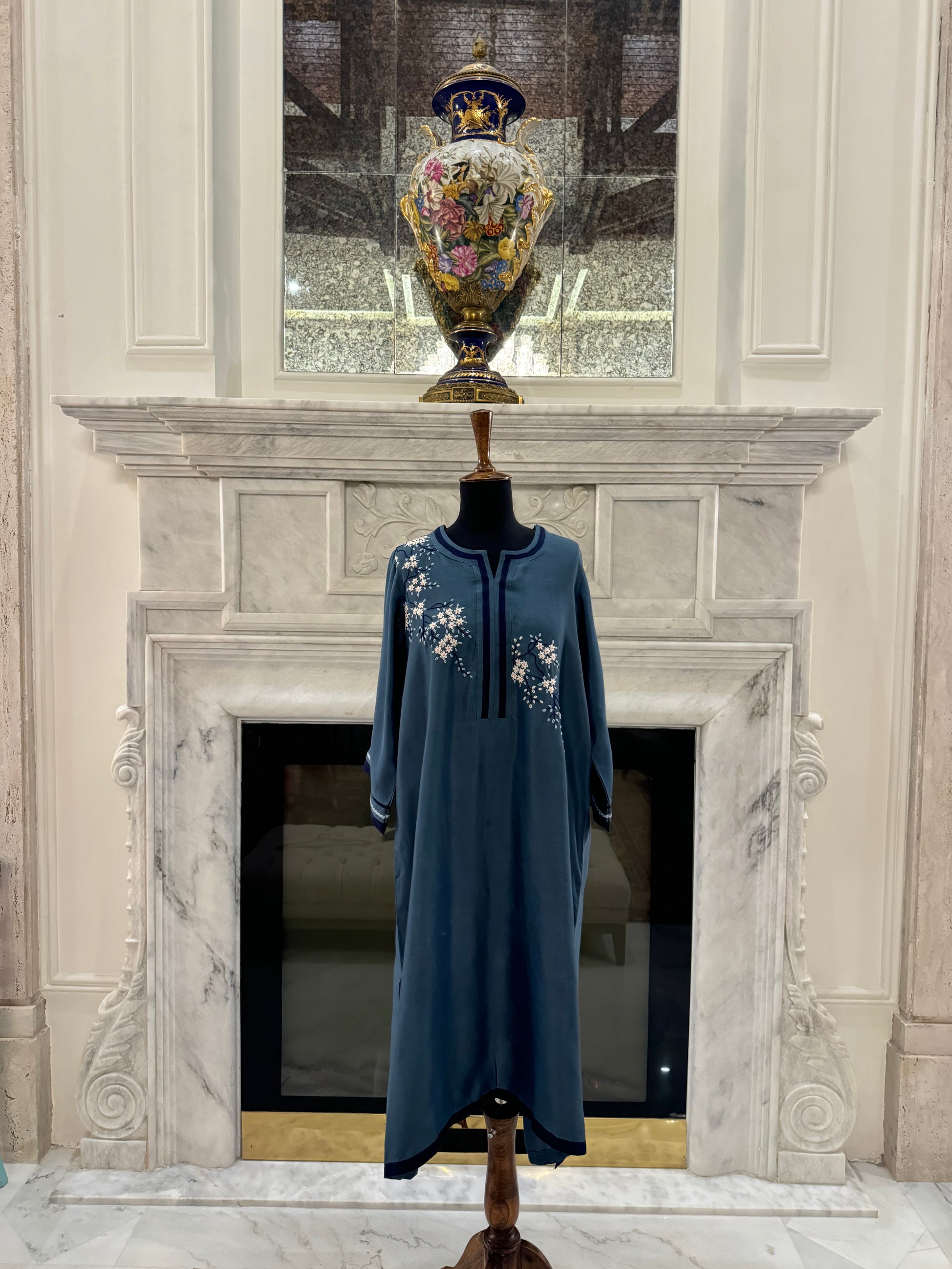 A serene ode to nature — this blueish-grey kurta is adorned with delicately hand-embroidered cherry blossoms, blooming softly across the fabric like poetry in motion. The subtle hue paired with intricate floral detailing creates a look that is graceful, timeless, and quietly striking.