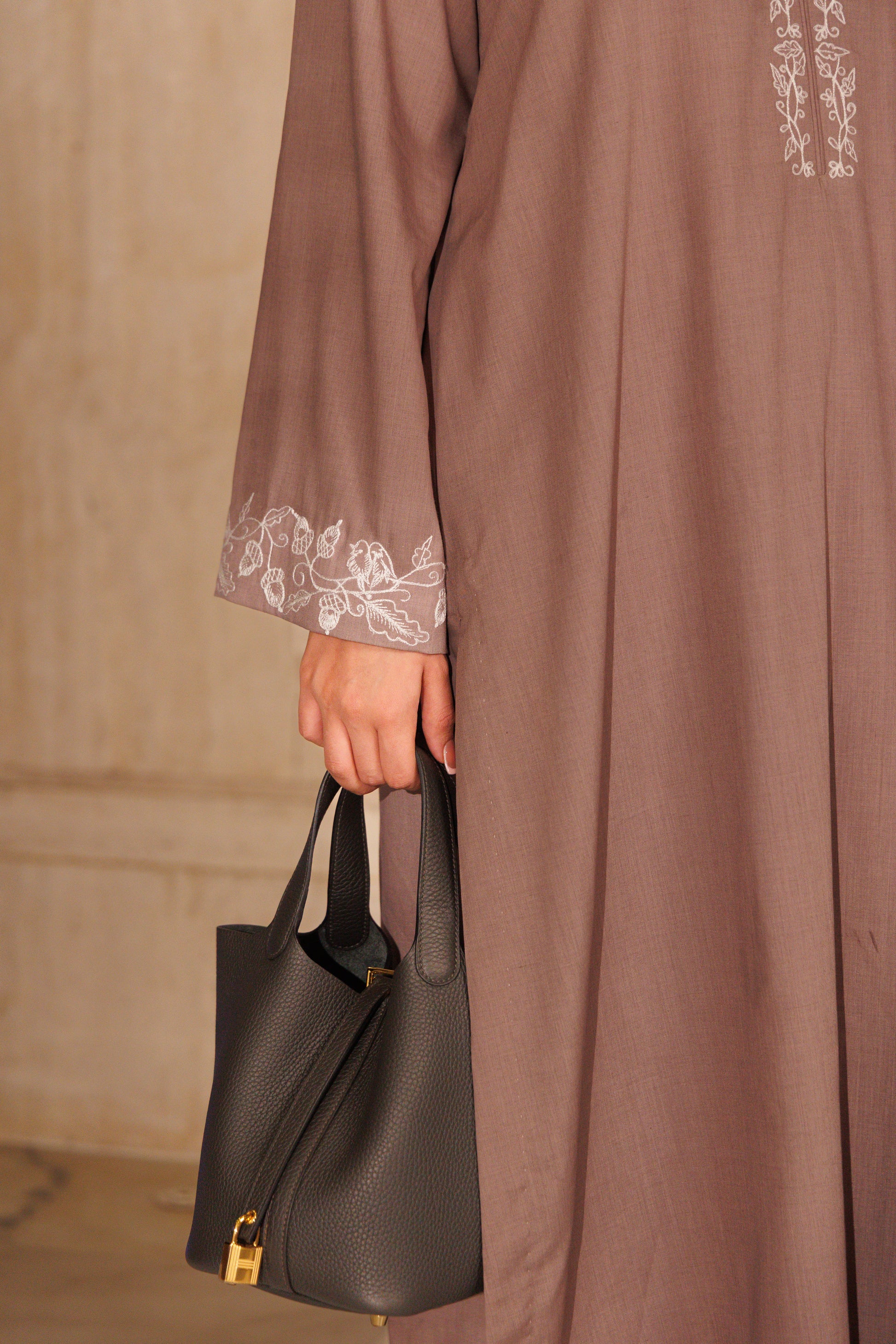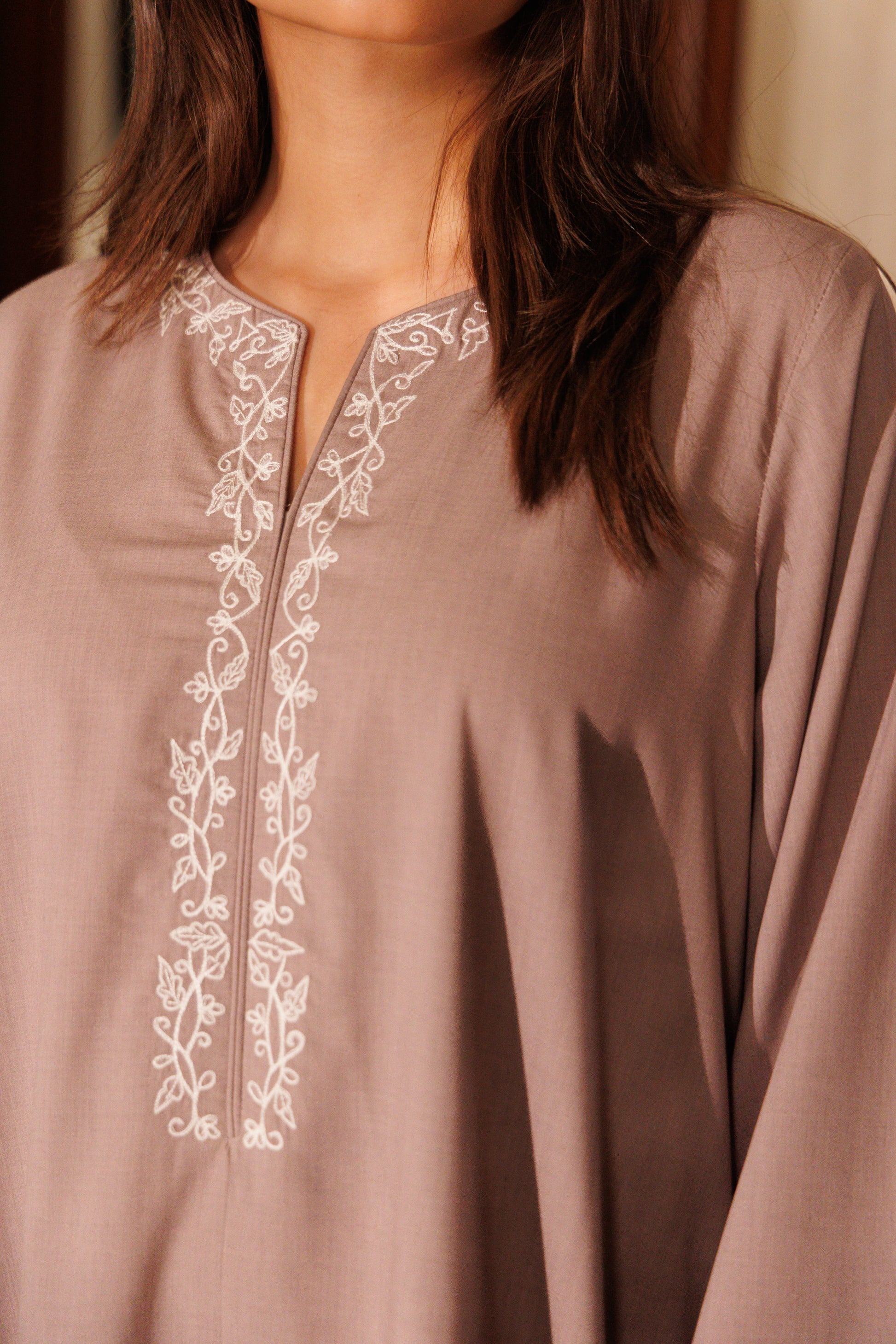 Clay Blush Set includes matching straight pants. This crease resistant fabric is easy to wear. It can be worn all year round. It has embroidery details on the neckline and sleeves.