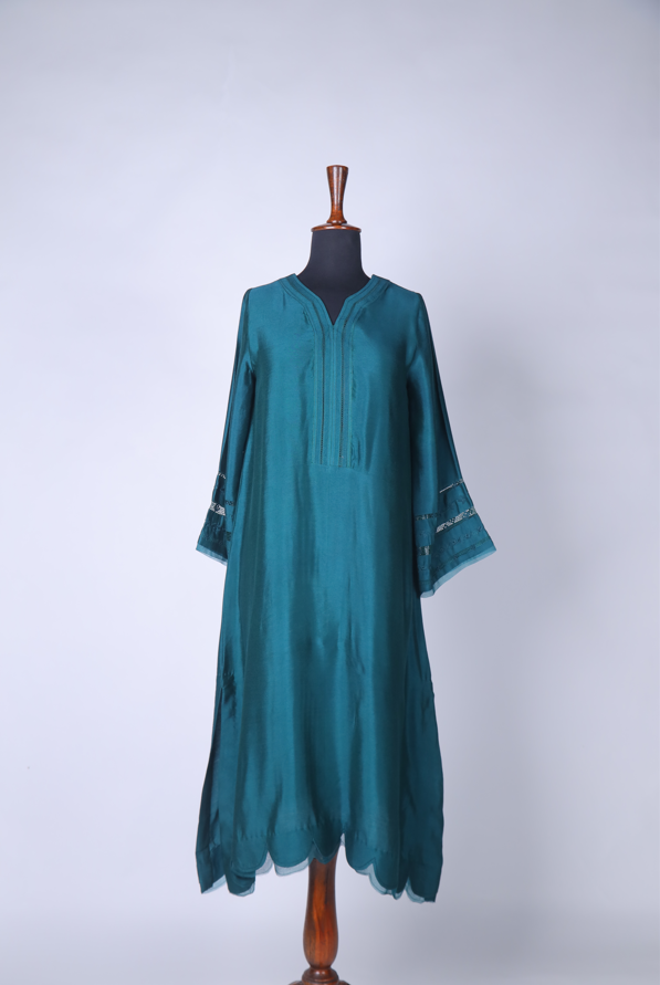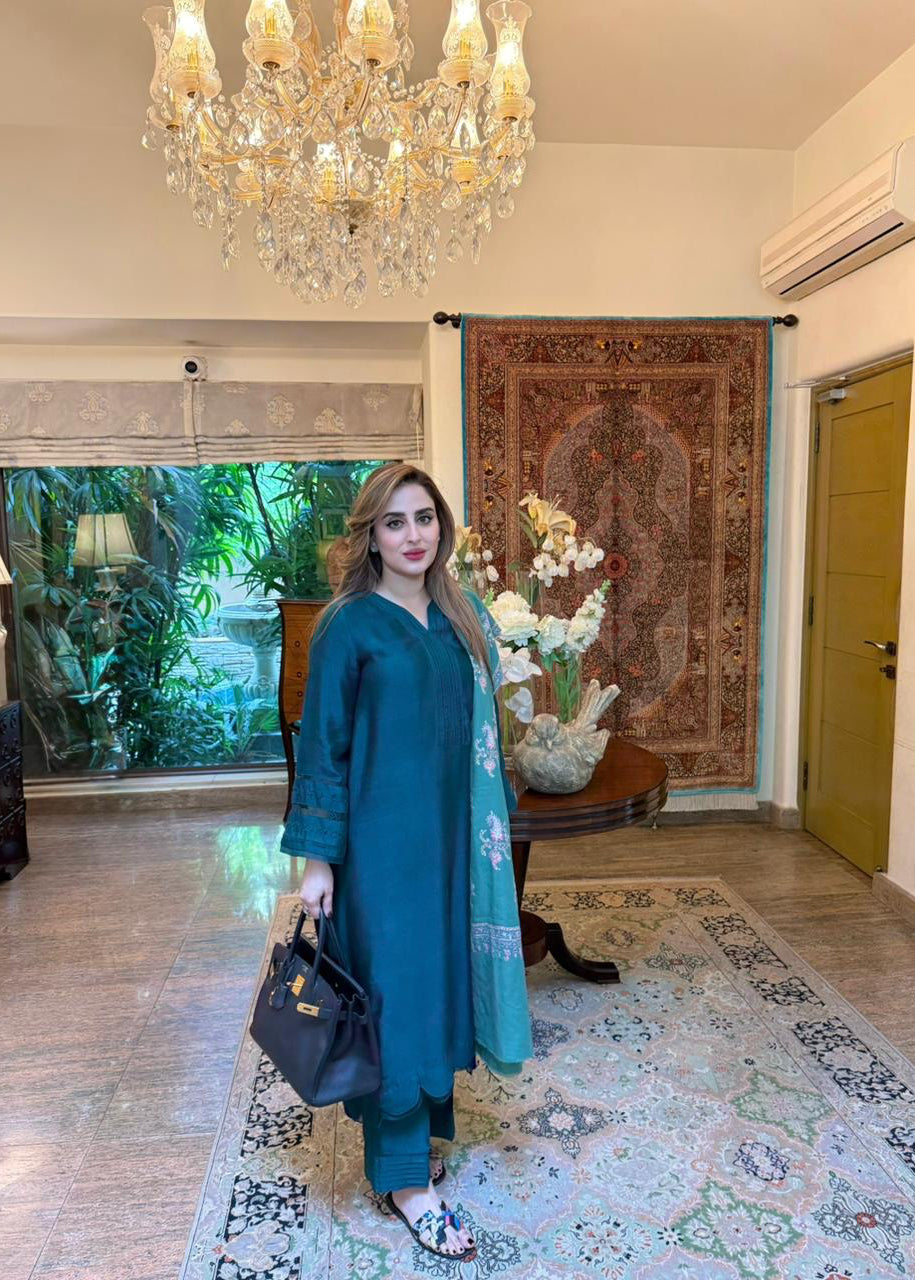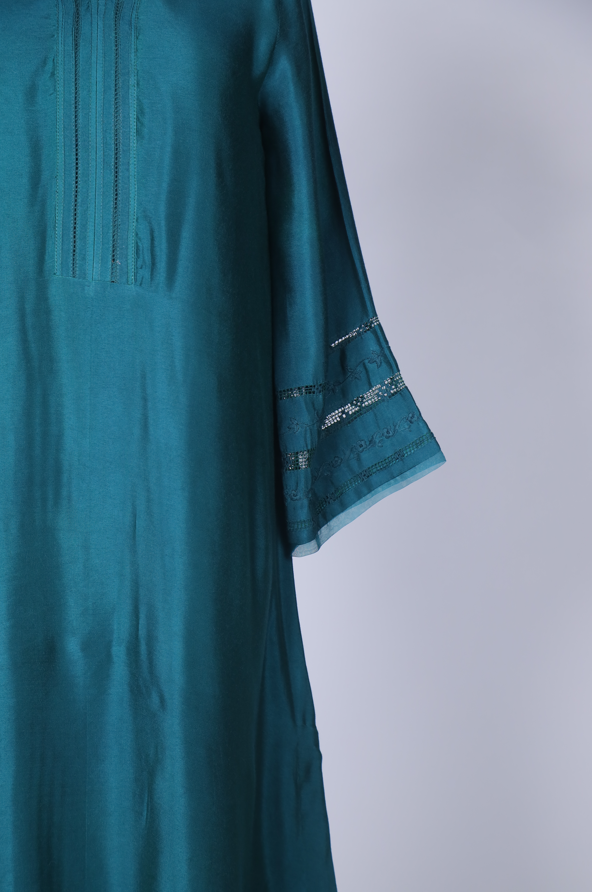 Deep Sea Set is beautiful teal colour, with delicate floral Hand embroidery and Tarkashi on the sleeves finished with organza details on the hem of the shirt.