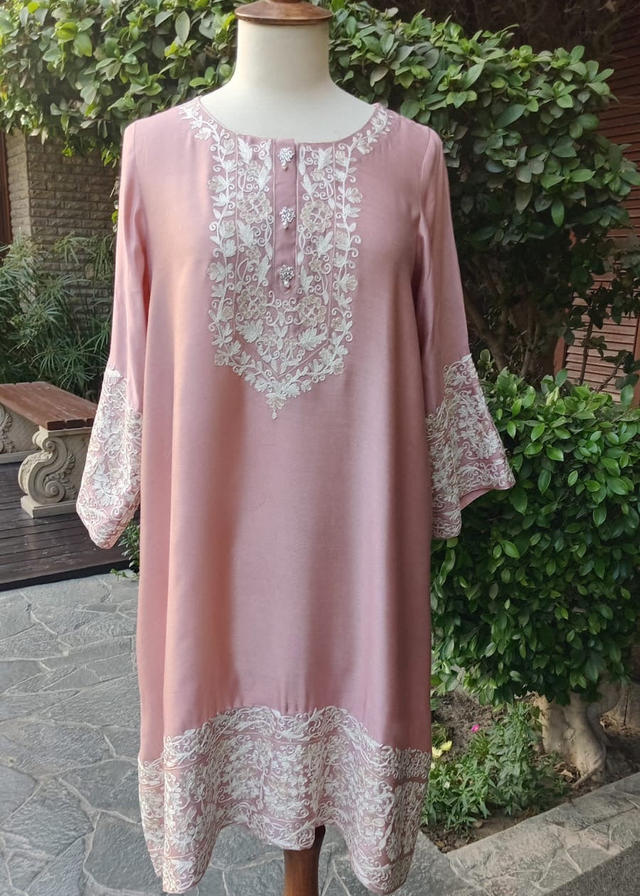 Dusky Pink Embroidered Cotton-Silk Kurta – Handmade Detailing | Available in Pink, Beige & Mint