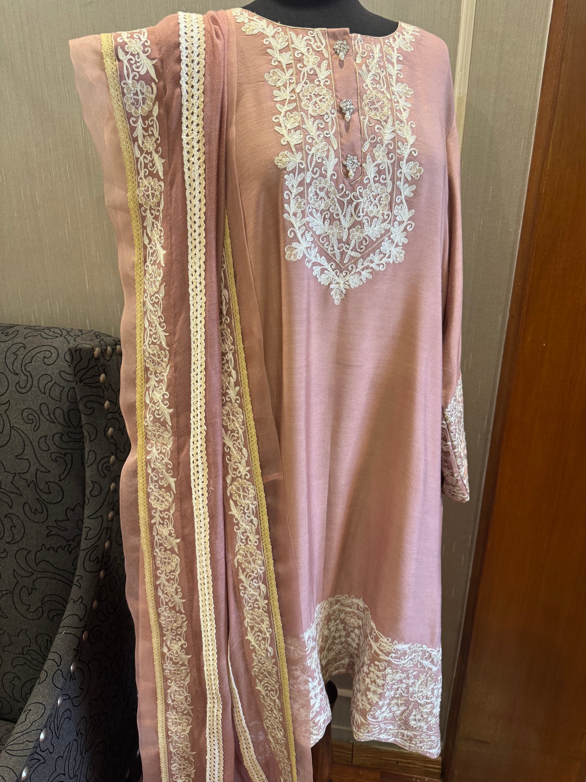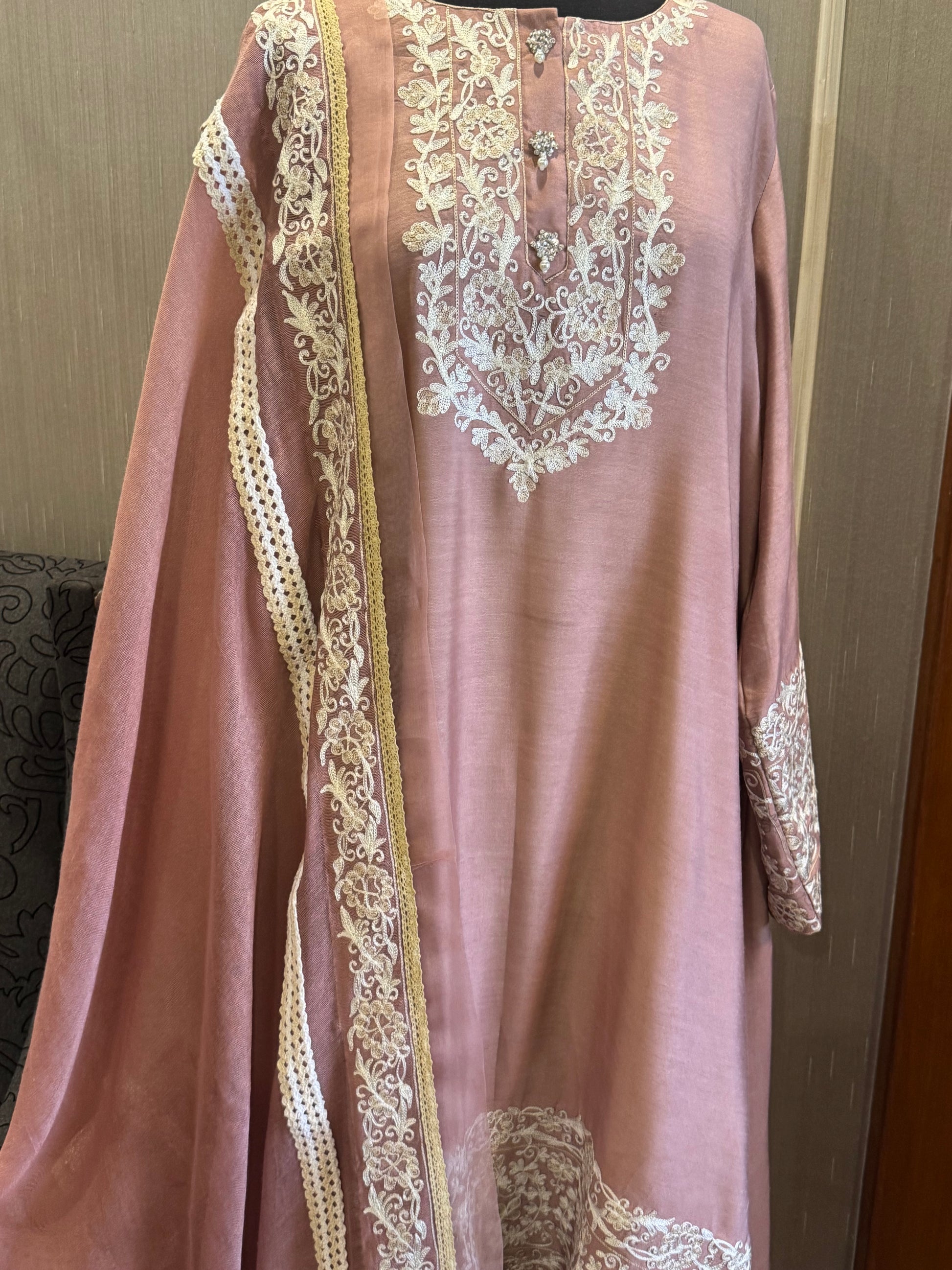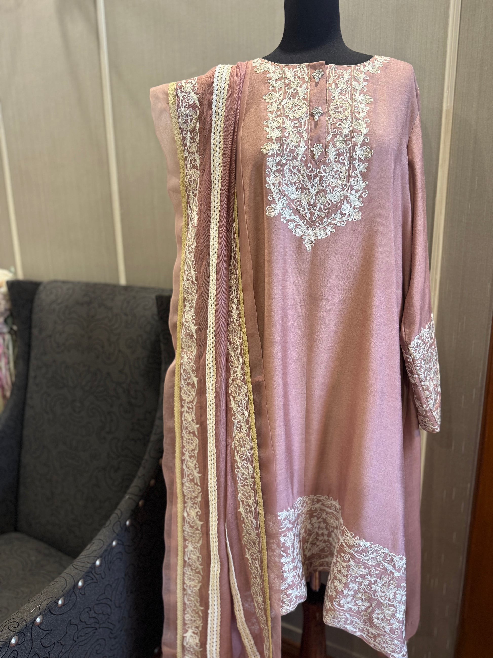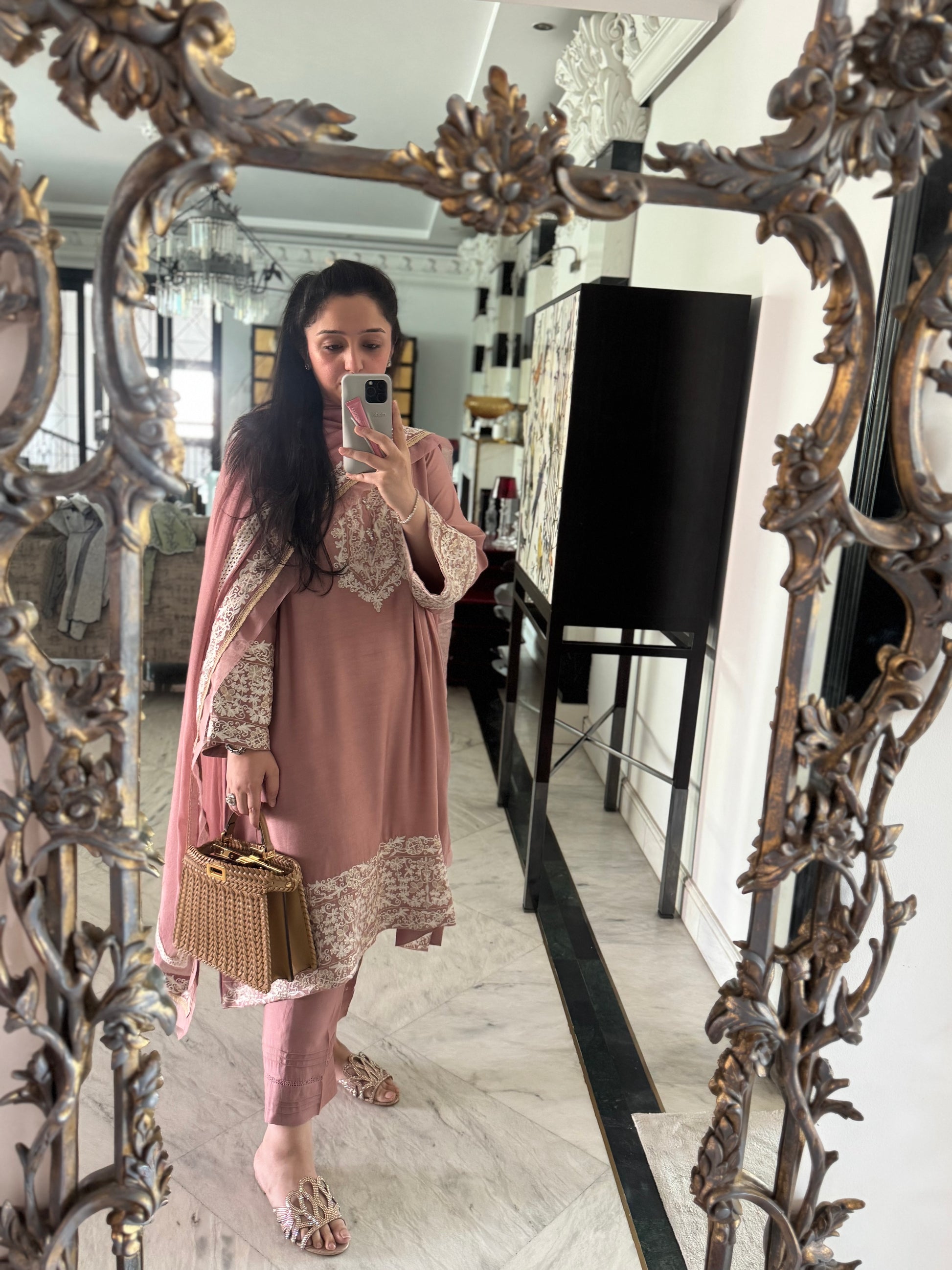 Elevate your festive wardrobe with this dusky pink embroidered kurta crafted from a breathable pure cotton-silk blend. Adorned with delicate floral embroidery and finished with handmade buttons, this design is the perfect blend of traditional craftsmanship and contemporary elegance. Whether you're attending a family gathering, a dawaat, or a festive celebration, this kurta offers effortless sophistication and all-day comfort.