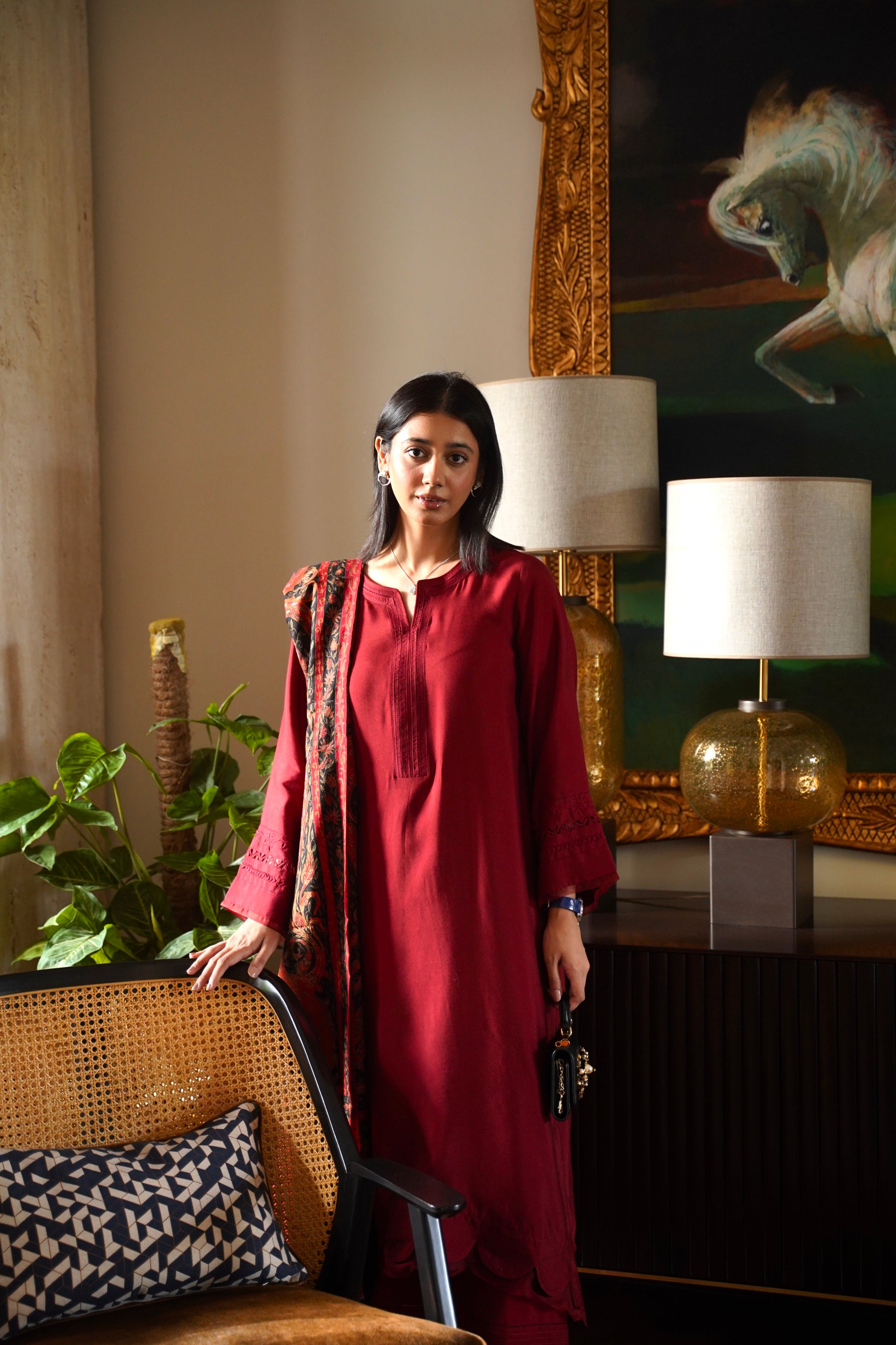 Rouge Amour Set has a Bow Hand embroidery pattern and delicate Tarkashi on the sleeves, finished with organza details on the hem of the shirt.
