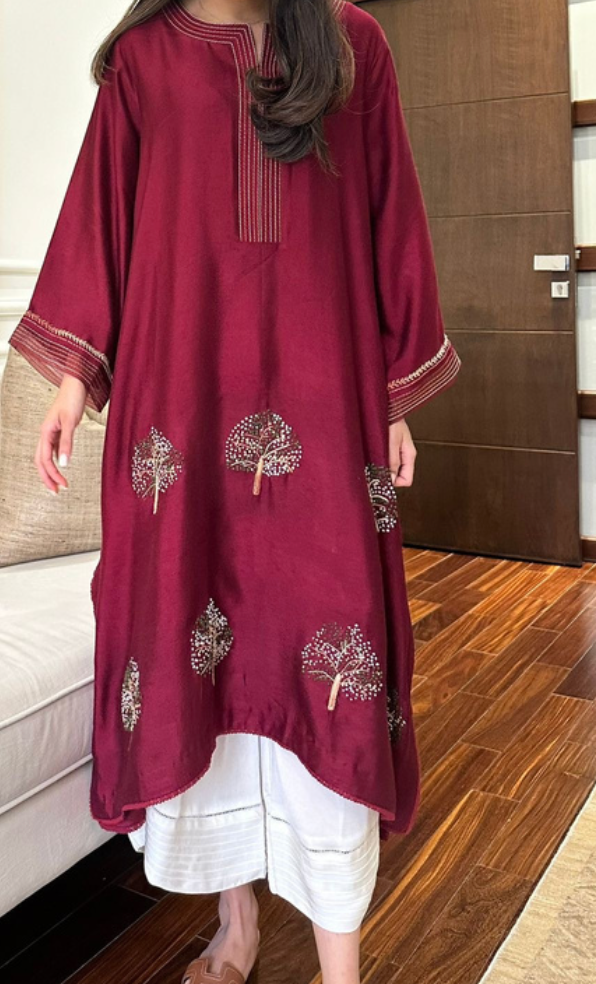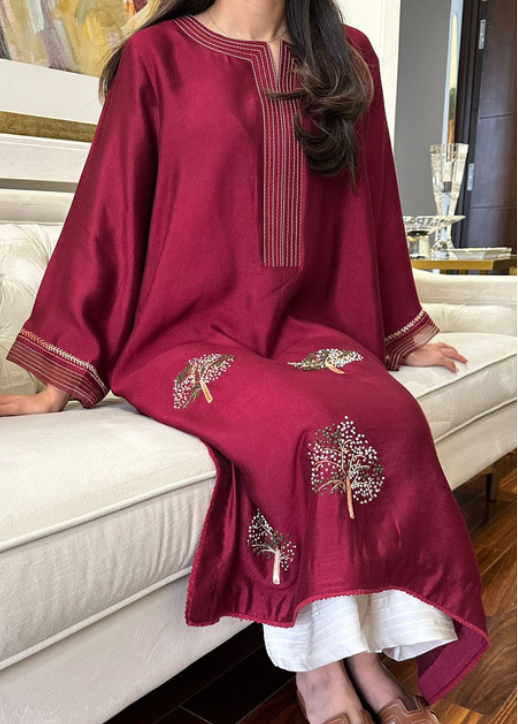 This burgundy cotton net kurta is more than just a stylish piece. Featuring beautiful french knots on fall trees.