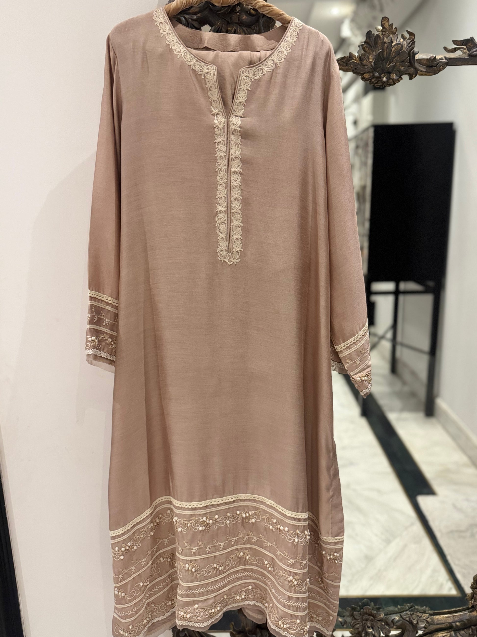 Classic, elegant, and timeless — this Cream Floral Kurta is hand-embroidered with intricate floral motifs, a true showcase of traditional Pakistani craftsmanship. Accented with organza inserts and delicate lace finishing, it’s a refined choice for Eid dinners, festive gatherings, or any special celebration.